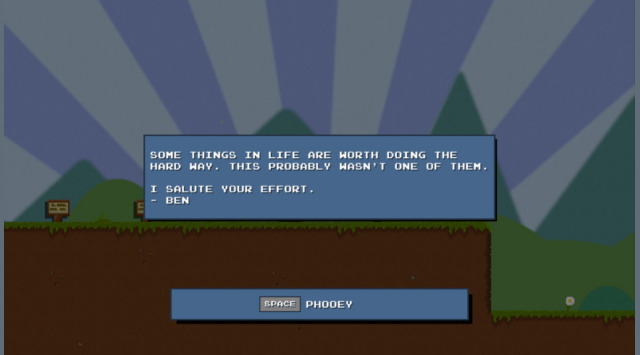 It took me 45 minutes to finish my first round of DLC Quest. It’s a fun little game – reminiscent of Upgrade Complete, really. It’s a game where you must upgrade everything to save the princess, including buying a menu. I liked it, and I think it deserves a Tier One place. It knew its sense of humor and was short and sweet enough to not get boring. My only technical complaint would be that the key remapping didn’t quite work (the up arrow key wasn’t mapped to jump). It almost slips into Tier Two because it doesn’t really commit to the joke of DLC Quest, but it was still an enjoyable 45 minutes.
